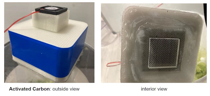 Humidity is controlled via three server fansātwo for intakes and one for exhausts. Two intakes are offset from the center to generate a spiral air flow. The exhaust is taken from the center passing through an activated carbon box to reduce odor. Designed air flow direction is shown below: