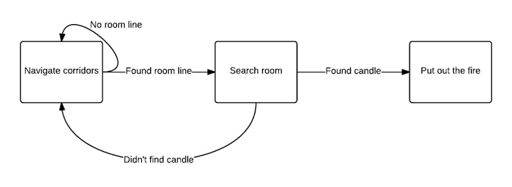 The code just was breakdown into 3 major parts. Navigating the corridors, searching the rooms and putting out the fire when it found it.pan>