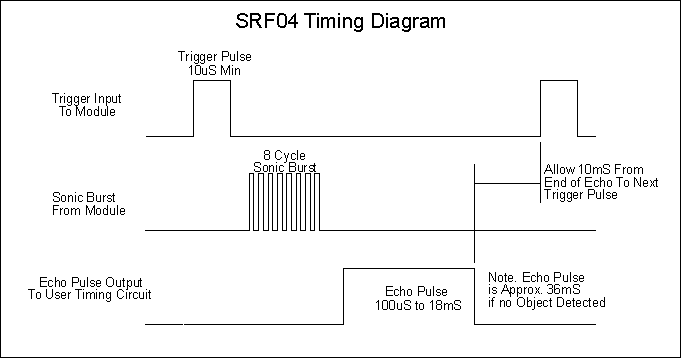The distance sensors used we're HC-SR04, pretty much a SRF04. These sensors require a 10us (at least 10us) pulse to start a reading and then return the distance reading with a high pulse of variable width - so you need to measure that pulse width to get the distance.