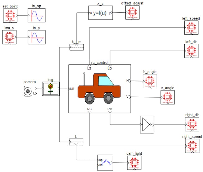 3) RC control block: It is a custom block that receives keyboard and mouse signals from the image display block and generates suitable control signals for controlling the robot motion and its head (pan & tilt) movements.