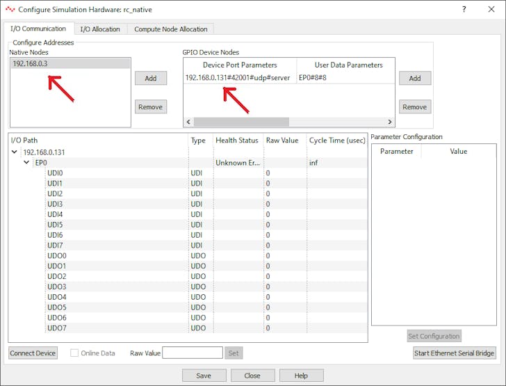 4) āConfigure Simulation Hardwareā window will open. Under Native Nodes and GPIO Device Nodes, change the IP addresses marked in the below figure (by double clicking on the item) to respective local and device IP addresses.