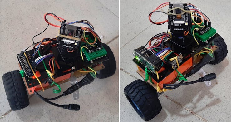 Two DC motors are fitted to a suitable base frame along with the wheels. Pan & tilt assembly (fitted with two micro servos) is mounted at suitable location of the frame. A 12V battery is mounted on the base frame. Required electronic modules are suitably placed on the base frame and are connected as per the connection diagram shown in āSchematicā section.Typical arrangement is shown in below figure