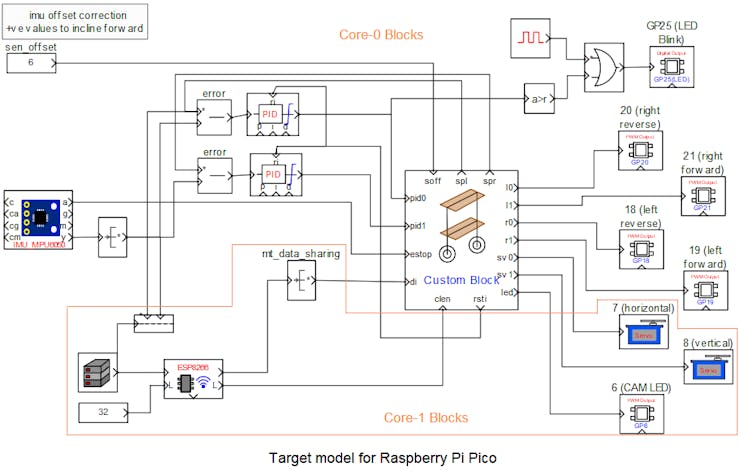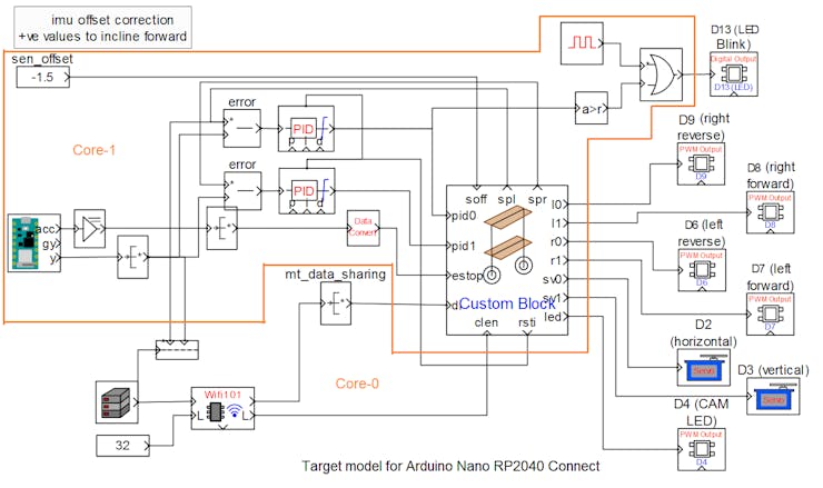 Arduino RP2040 is having on-board IMU and WiFi, as such external components required are minimum. Core-0 is used for WiFi communication and all PWM blocks for driving wheels and camera pan & tilt servos. Core-1 is extensively used for IMU and blocks required for balancing the robot.