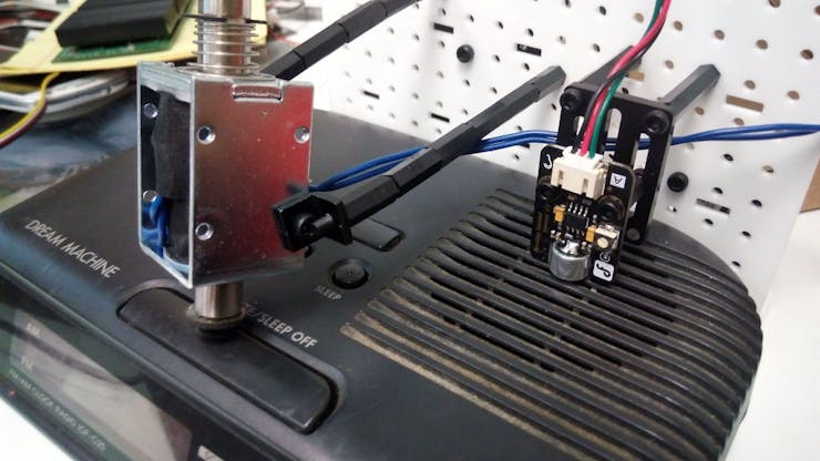 Ever want to just stay in your warm bed on those cold, dreary autumn mornings? Now you can! With Snoozebot, you will be able to keep your alarm set, mitigating any guilt you might feel for hitting the snooze button on your alarm when it goes off! Just set up Snoozebot and it will hit the snooze button so you don't have to wake up and deal with the fact that humans do not have a natural hibernation cycle! This is a simple build using an Arduino, Sound Sensor, Relay, and Solenoid. Want your own Snoozebot? Let's get started!