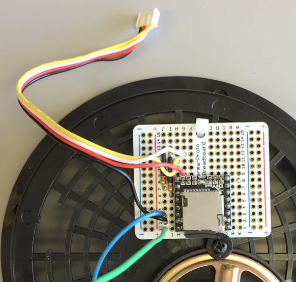 Clip the connector off one end of a Grove cable, thread the cable through the center hole in the back of the cauldron (such that the end that still has the connector is on the outside of the cauldron) and then solder the wires to the LED disc as follows: