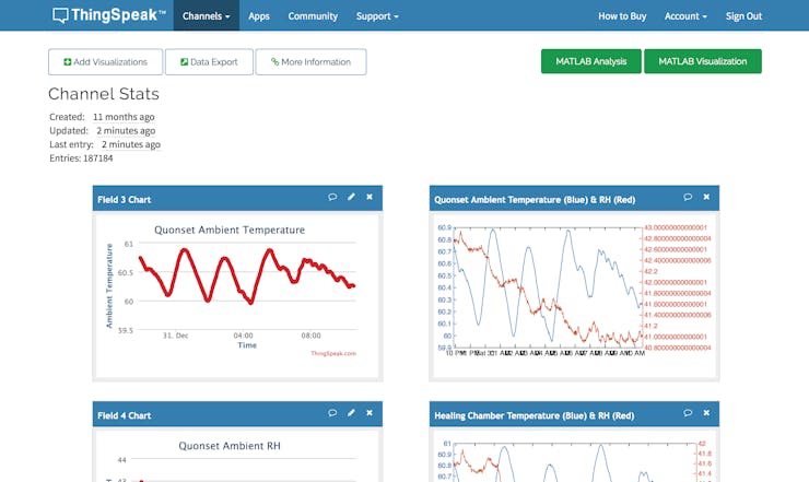 5) It uploads the averages from both sensors with the time and date to ThingSpeak every 63 seconds.