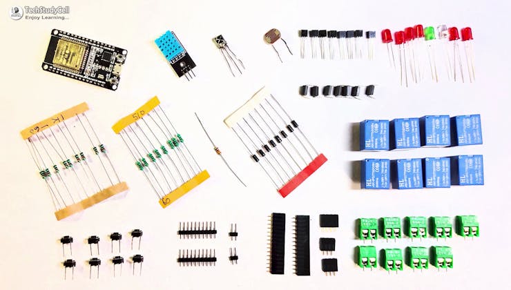 ESP32 DEVKIT V1TSOP1838 IR receiver (with metallic case)Relays 5v (SPDT) (8 no)BC547 Transistors (8 no)PC817 Optocuplors (8 no)510-ohm 0.25-watt Resistor (8 no) (R1 - R8)1k 0.25-watt Resistors (10 no) (R9 - R18)LED 5-mm (10 no)1N4007 Diodes (8 no) (D1 - D8)Push Buttons (8 no) or SwitchesTerminal ConnectorsJumper5V DC supply