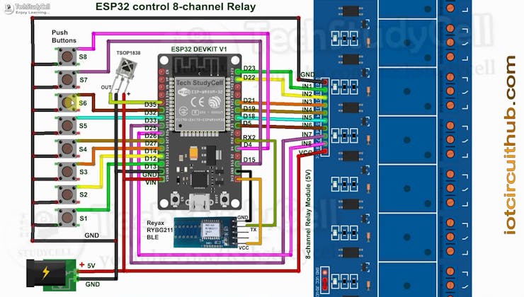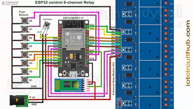 The circuit is very simple, I have used the GPIO pins D23, D22, D21, D19, D18, D5, D25 & D26 to control the 8 relays.