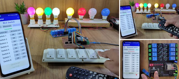 ESP32 DevKIT V1 Amazon4-channel or 8-channel 5V SPDT Relay Module AmazonTSOP1838 IR receiver (with metallic casing)Bluetooth or BLE module (ANY)Manual Switches or Pushbuttons AmazonAny IR Remote