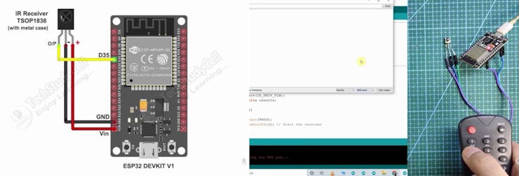 Now, to get the HEX codes from the remote, first, we have to connect the IR receiver output pin with GPIO D35.