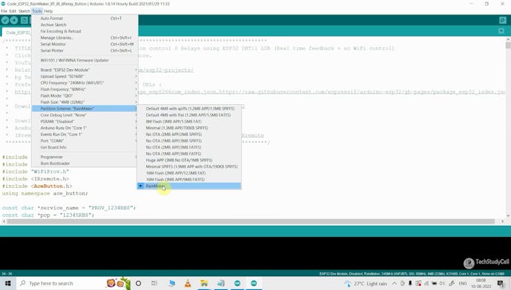 After that, select the ESP32 DEV Module board, RainMaker Partition Scheme, and proper PORT.Ā Then upload the code to ESP32 Board.Ā