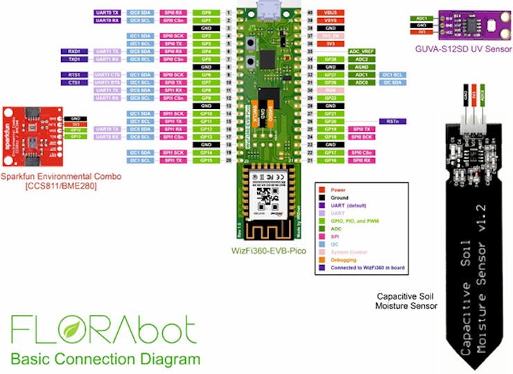 WizFi360-EVB-Pico board acts as the main controller and interfaces with Sparkfun Environmental Board (CCS811/BME280) over I2C [GPIO 12 & 13] and Capacitive Soil Moisture v1.2 probe & GUVA-S12SD UV sensor over analog ports [A0 & A1] respectively.