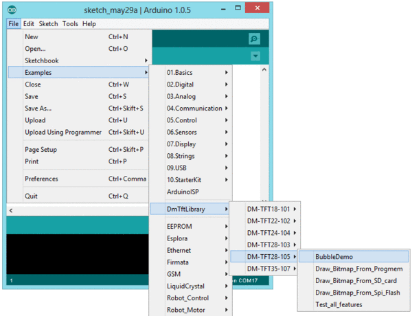 First download the DmTftLibrary from dmtftlibrary.Ā Extract the content to your Arduino library folder. In Windows this is usually located in Arduino IDE folder\libraries. Check Arduino's official guide if you want more information on how to install the Arduino Library. The official guide of Arduino.Ā Start Arduino IDE, open the sample code, click "File--> Examples-> DmTftLibraries", select the right board and COM port: DM-TFT28-105Ā Open the Example and upload to your Arduino board.Ā