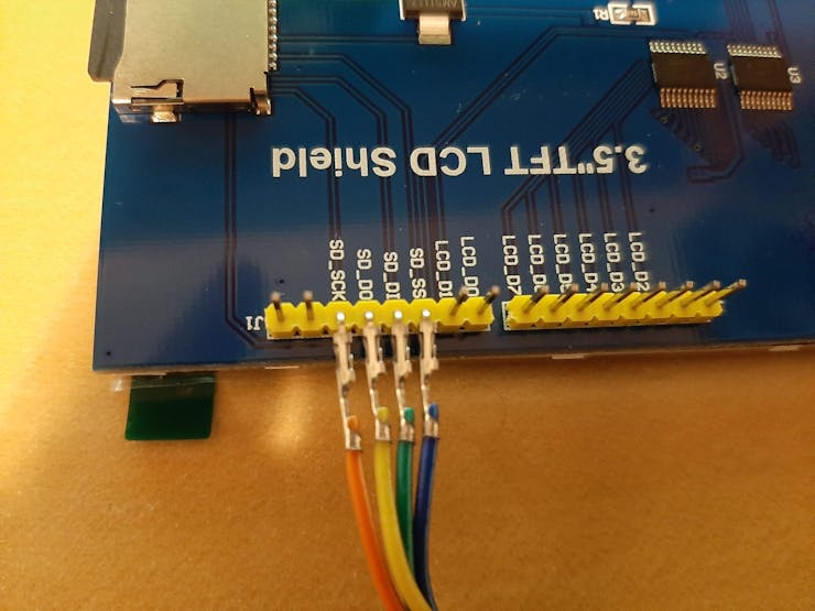After testing the default program supplied with the display (attached to this project), I worked to modify the program to suit my needs. The first challenge that came up was that the software was intended to be used with the Arduino Uno, but for this project I needed to use something with more pins as there were none extra available for use with the Uno. The SPI pins of the shield lined up with the SPI headers of the Uno, which are different for the Arduino Mega. The fix for this was to bend out the display pins and reroute them to the appropriate headers on the Mega.