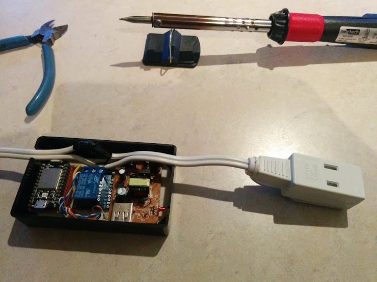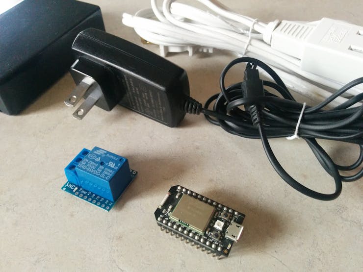 I used an "ancient" Particle Core I had around (you can use a Photon too or most probably any other Arduino compatible MCU) and wired it together with a Wemos mini relay [https://wiki.wemos.cc/products:d1_mini_shields:relay_shield] (or any Arduino compatible will do) and a 5v 1Amp power source that I recycled from an old phone charger. You are going to need a plastic box and electrical tape.