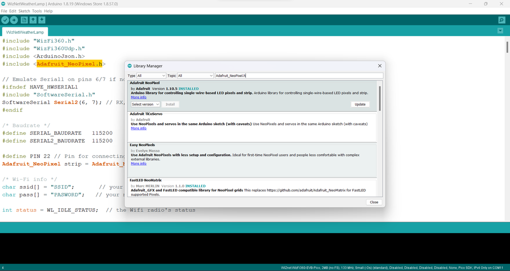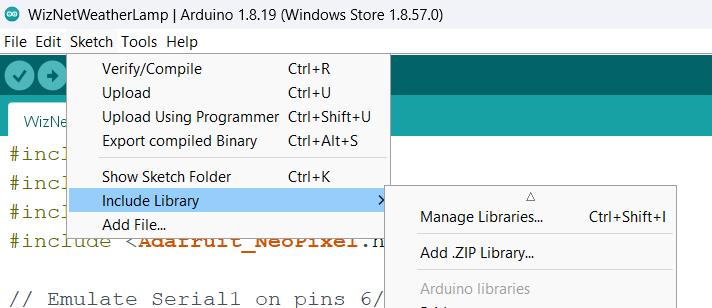 *Now got to Sketch->Include Library->Manage Libraries and Search for ArduinoJson, Adafruit_NeoPixel and install them.