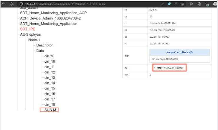 Activate the OM2M server. Opened the browser to access the OM2M IoT platform web interface: http://127.0.0.1:8453/webpage