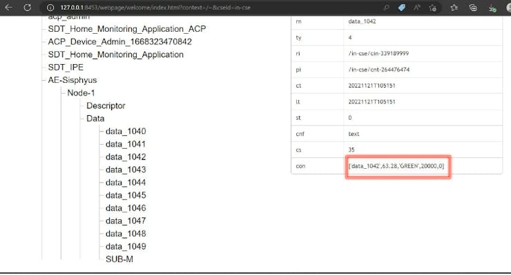 We can see the content instances under the "Data" container updating the OM2M server. The attributes on the right also show the data sent from the Node MCU microcontroller Arduino IDE code. We are sending the data specifications of