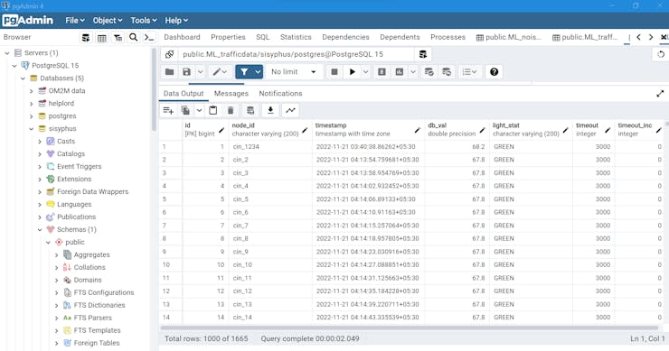 The Noise Pollution levels and Traffic Signal Controller Dashboard is set up on Grafana. The OM2M server content instances will then be posted to a time-series database in PostgreSQL.