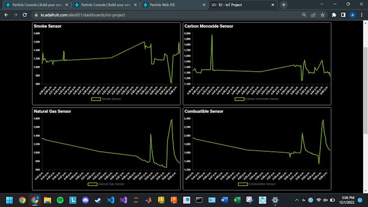 The team started by researching sensors to use for the particle argon. The team ultimately decided to use the MQ2, MQ5, MQ7, and MQ9 sensors. Each of these sensors would be connected to an LED and could communicate with the other person's particle via a "buddy" LED. Each of these sensors had a multitude of gasses it could detect, including: