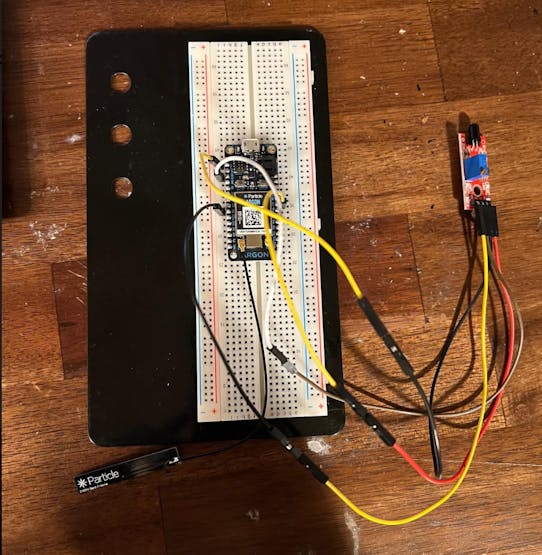 The flame sensor breadboard consists of the sensor, jumper wire, and the argon. The way our sensor works is that it will read a value over time and subscribe/publish to our other argons once the flame sensor value reads below a value of 500 coming from the sensor indicating that there is a flame or undesired heat source left on coming from the stove.