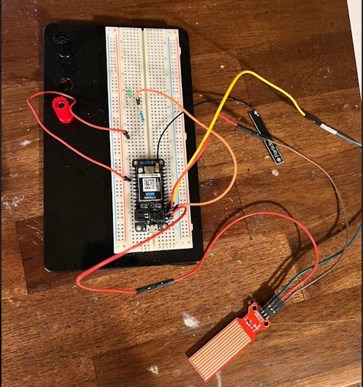 The water level sensor breadboard consists of the sensor, jumper wire, 10k resistor, green LED and the argon. The water level sensor works is that it will read a value over time and subscribe/publish to our other argons once the water level sensor value reads a "High" value greater than 800 indicating that there is water in the water container and the code will automatically turn on the LED light. The low value will be any readings below 500 on the water level sensor which will have no LED light paired with it indicating the water container should be refilled.