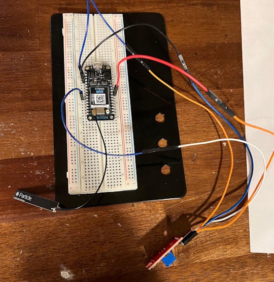 The temperature sensor breadboard consists of the sensor, jumper wire, and the argon. The way the temperature sensor works is that it will read a value over time and subscribe/publish to our other argons once the temperature sensor value reads a "High" value greater than 700 indicating that the fridge is open and the temperature inside of the fridge is warming up and there could be harm to the contents inside. The code will automatically turn on the LED light when this happens. The low value will be any readings below 500 on the sensor which will have no LED light paired with it indicating the status of the refrigerator is normal.
