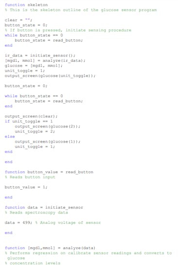 I learned that temperature impacts the IR spectroscopy reading quite significantly. To account for this, the sensor module includes a calibration circuit which automatically corrects the analog voltage reading of the IR sensor. Since glucose concentration can be measured in mg/dL or in mmol/L, I am including a feature that enables the user to toggle between the different units. Furthermore, a patient might not be aware of what the reading means, so I use color coded LEDs which classify the glucose reading into severe/moderate dysglycemia, mild dysglycemia, or healthy. I also made the skeleton of the program in MATLAB, so when the parts arrive I can get started with rapid prototyping.