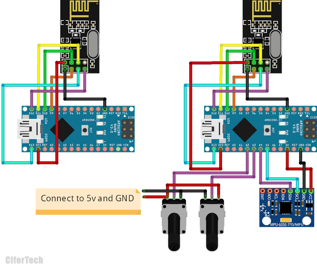 Arduino NanoMPU6050 GyroscopenRF24L01 Wireless Transceiver2 PotentiometersĀ