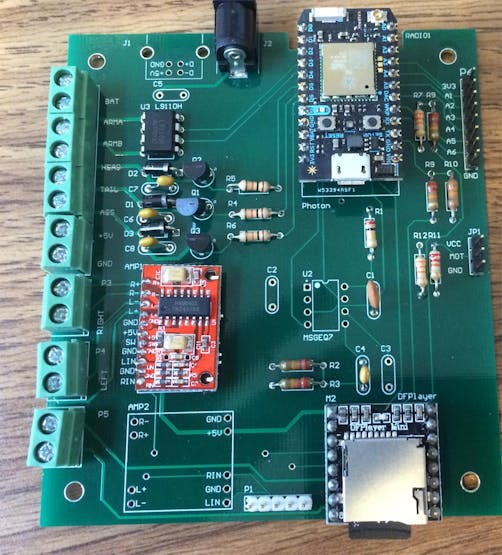 The DFPlayer uses a microSD card to store MP3 and WAV coded sounds or music. a typical use allows for 99 numbered folders for music or sounds, a folder for "mp3" and a folder for "advertisements". We can put a 32 Gbyte micro SD card into the module which means hours of stored music. the module has a stereo audio output as well as a built in 1 watt monophonic speaker amplified. One Watt is certainly loud enough to entertain and annoy your intended audience, but I also put the foot prints for two versions of carrier boards for the PAM8403 3 watt stereo class D amp. A library of commands are available for the DFPlayer that are sent to it via the auxiliary UART pins on the Photon. When an ADVERT command is sent the file chosen interrupts the current audio program and plays the advertising file after which the current program resumes.