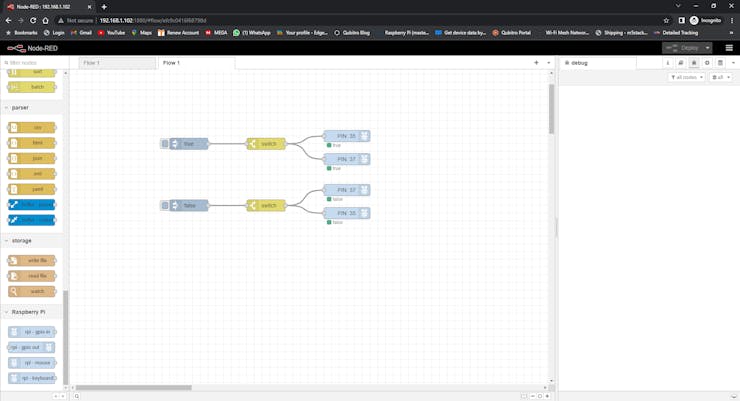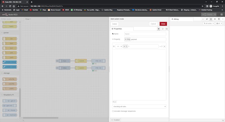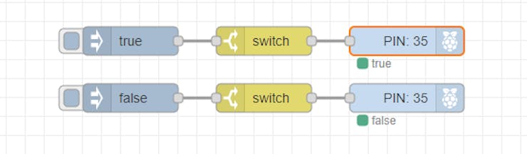 Then add some inject nodes, switch, and GPIO out nodes and connect them as follows.