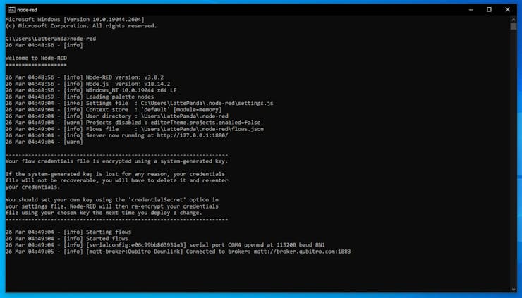 In that message you can see some IP address with the port number. In my case it is http://127.0.0.1:1880. Enter this local Ip address in the LattePanda's browser.