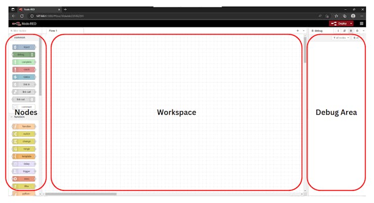 In the left side you can see the Nodes tab by using this node only we are going to create the flows and the middle portion is Workspace area in here only we are going to develop the flow. And the last section is the Debug Area by using this section we can debug and see the response of the flow.