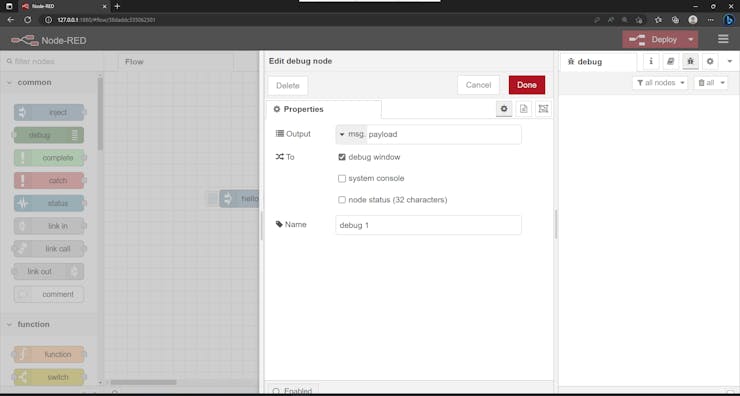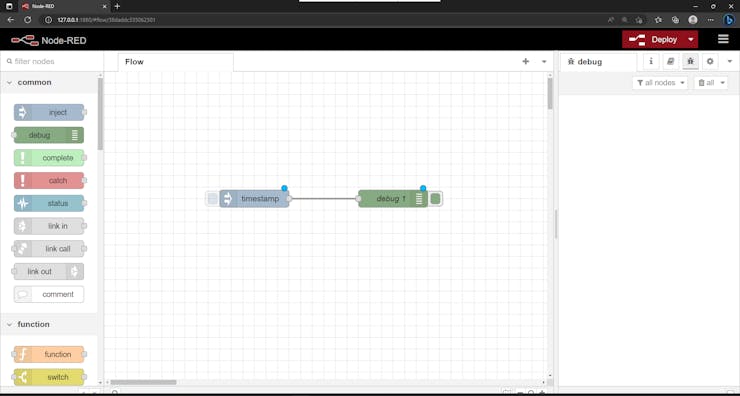 Add the Inject and Debug node to the workspace and just make simple connection between the nodes.
