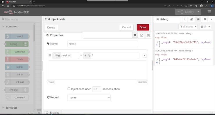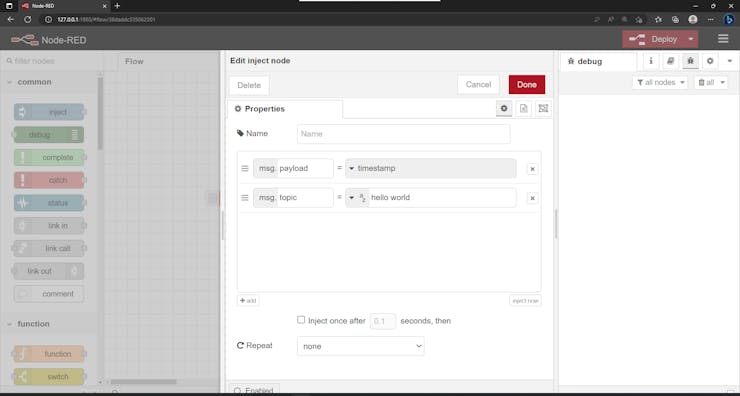 Next, double click the Inject node and it will show some properties of the node, we have to configure them according to our need.