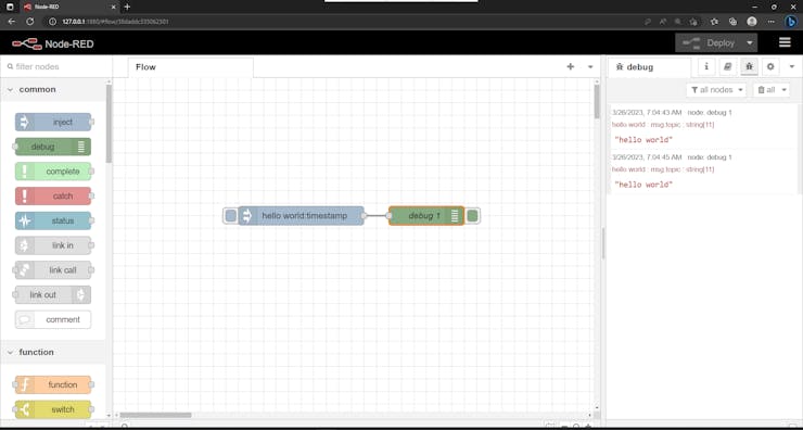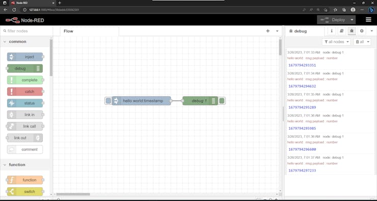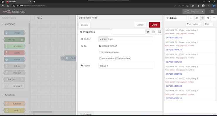 It will now show you the timestamp values. Again, double click the Debug node and change msg.payload [http://msg.payload/] to msg.topic [http://msg.topic/] then click deploy.
