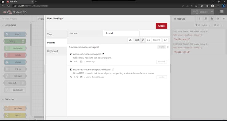 First, we have to install one new node. node-red-node-serialport type this in the node red pallet section and install that.