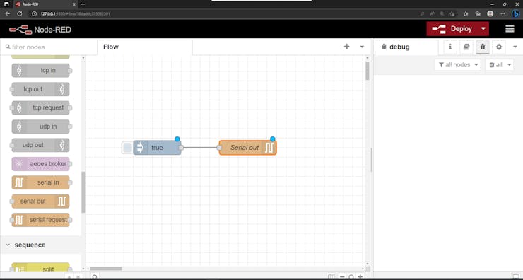 We are going to use the Serial out node to control the LED. Add the inject and Serial out node then make a connection.