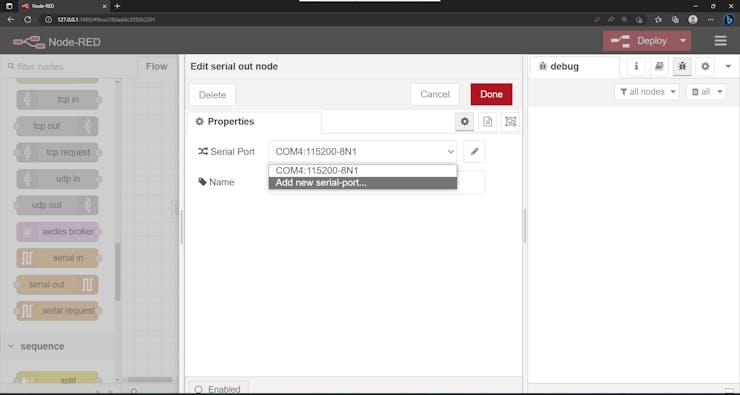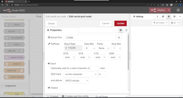 Then we have to add the properties of the serial out node. First select the correct com port and select the edit.