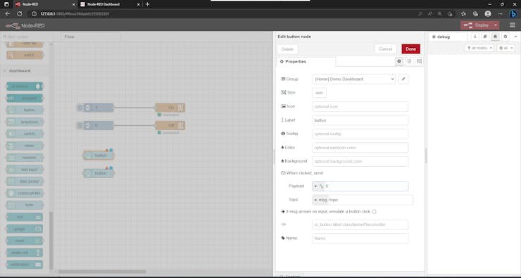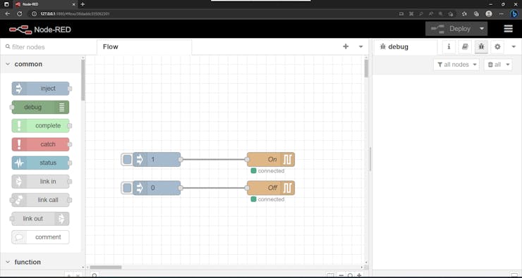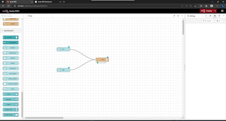 Next move to the Node Red workspace and try to inject the data. Based on the inject node it will turn on and off the led. Now everything is set we can easily control the led via the workspace.