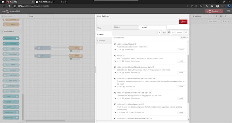 But if it's a UI means it will more good right? Next, we are going to add the UI into it. Go to the pallet option and search for dashboard node.node-red-dashboard