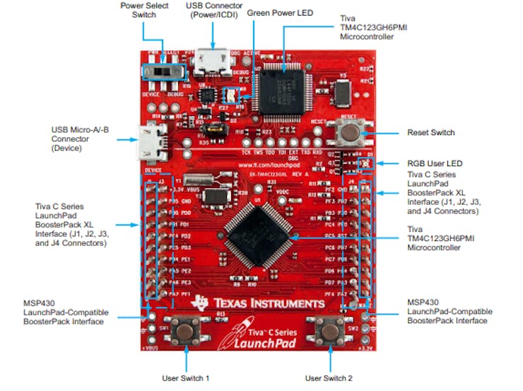 Tiva TM4C123GH6PMI microcontrollerMotion control PWMUSB micro-A and micro-B connectors for USB device, host, and on-the-go (OTG) connectivityRGB user LEDTwo user switches (application/wake)Available I/O brought out to headers on a 0.1-in (2.54-mm) gridOn-board ICDISwitch-selectable power sources: – ICDI – USB deviceReset switchPreloaded RGB quickstart application
