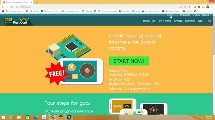 Communication via the Internet is done using the RemoteXY online application, which is free of charge up to a maximum of 5 graphic components on the screen, in our case there are 4, so the application and the created project are free.