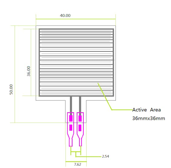 This is a square flexible thin film pressure sensor of short legs with a side length of 40mm, which can be used to realize highly sensitive detection of pressure. The sensor is durable and designed to sense static and dynamic pressure in high response speed. Its advantages of recording the intensity and frequency of force make it widely used in all kinds of applications, such as pressure switch, bed monitoring system, intelligent sneaker and medical device system. These sensors are also very easy to use.