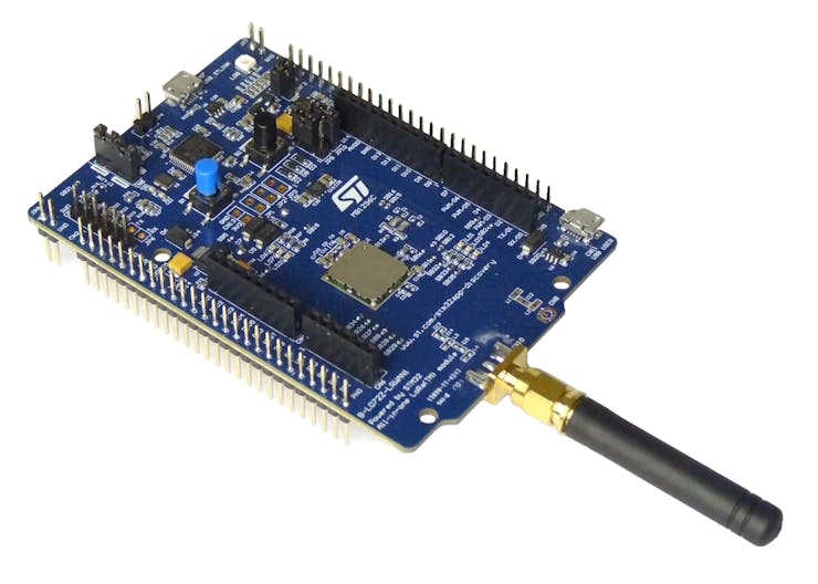 The B-L072Z-LRWAN1 from STMicroelectronics is a low power wireless STM32L0 LoRa discovery kit. This kit for LoRaWAN and LPWAN protocols with STM32L0. It is a development tool to learn and develop solutions based on LoRa and FSK/OOK technologies. It features an all-in-one open module CMWX1ZZABZ-091 (by Murata). The module is powered by an STM32L072CZ and an SX1276 transceiver. The transceiver features the LoRa long-range modem, providing ultra long range spread spectrum communication and high interference immunity, minimizing current consumption. Since CMWX1ZZABZ-091 is an open module, the user has access to all STM32L072 peripherals such as ADC, 16bit timer, LP-UART, I2C, SPI and USB 2.0 FS (supporting BCD and LPM). It also features an onboard ST-LINK/V2-1 supporting USB re-enumeration capability, USB ST-LINK functions, through USB bus or external VIN /3.3V supply voltage or batteries, 3xAAA-type-battery holder for standalone operation. The LoRaWAN stack is certified class A and C compliant. (More info)