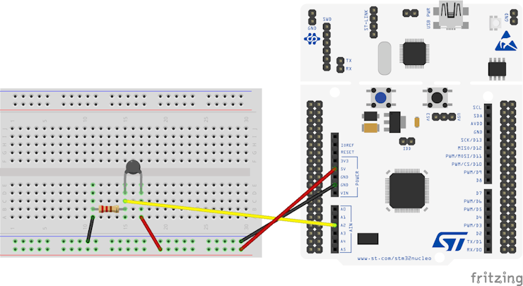 The schema of the connection of the NTC thermistor to the B-L072Z-LRWAN1 board is shown below:
