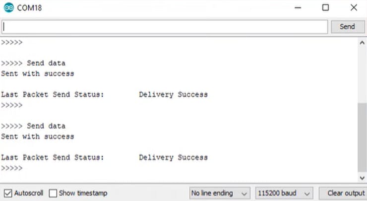Here is the serial monitor data from the transmitter, once you press the transmitter button it will send the command to the receiver node. If it is received by the receiver it will mark as a success.