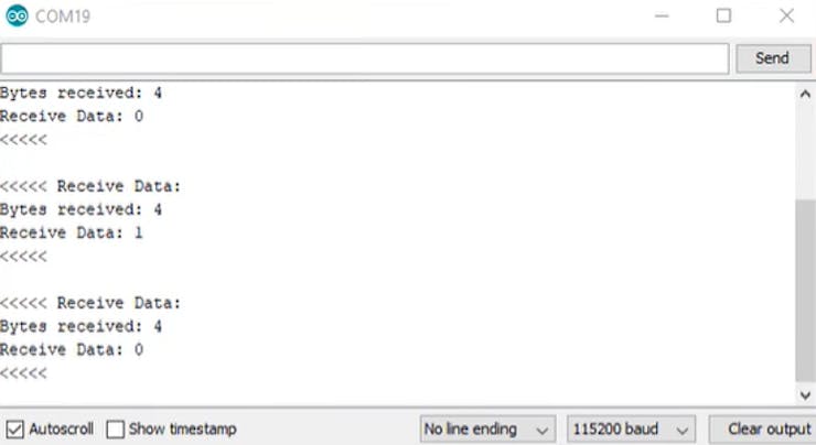 Here is the serial monitor data from the receiver, once the command from the transmitter is received by the receiver it will show the data and start to glow the led.