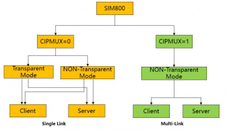 In single-link mode, the SIM800 serial module can function in both transparent and non-transparent transmission modes. In both of these modes, the module can be configured as either a TCP/UDP client or a TCP server.