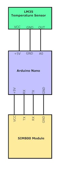 In this project, LM35 temperature sensor data is being transmitted to the ThingSpeak platform through an Arduino Nano and a SIM800 module. The SIM800 module is leveraged to establish a GPRS connection, facilitating the transmission of data to ThingSpeak at specified intervals.